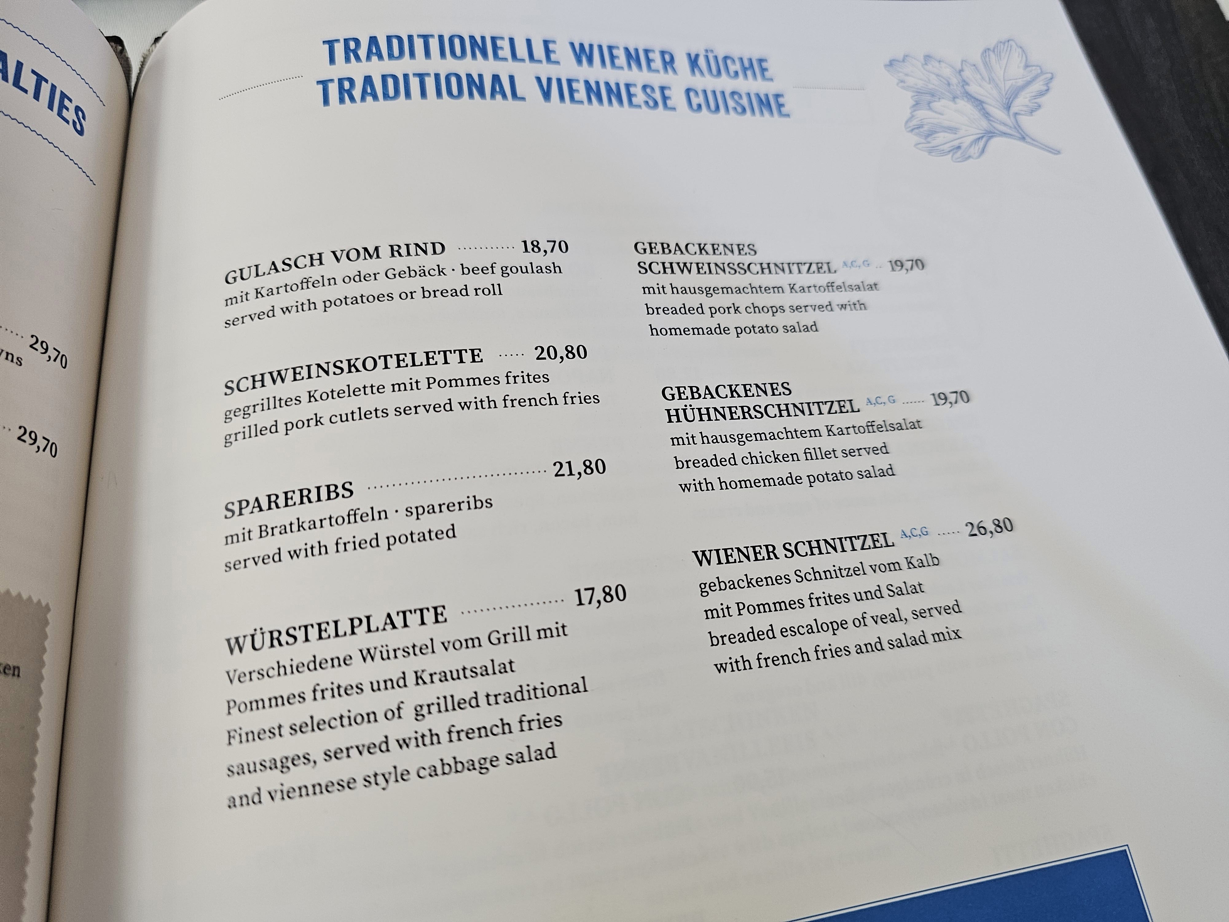 - 메인 요리: 16~28유로 (비너 슈니첼 22유로, 굴라쉬 18유로 기준)
