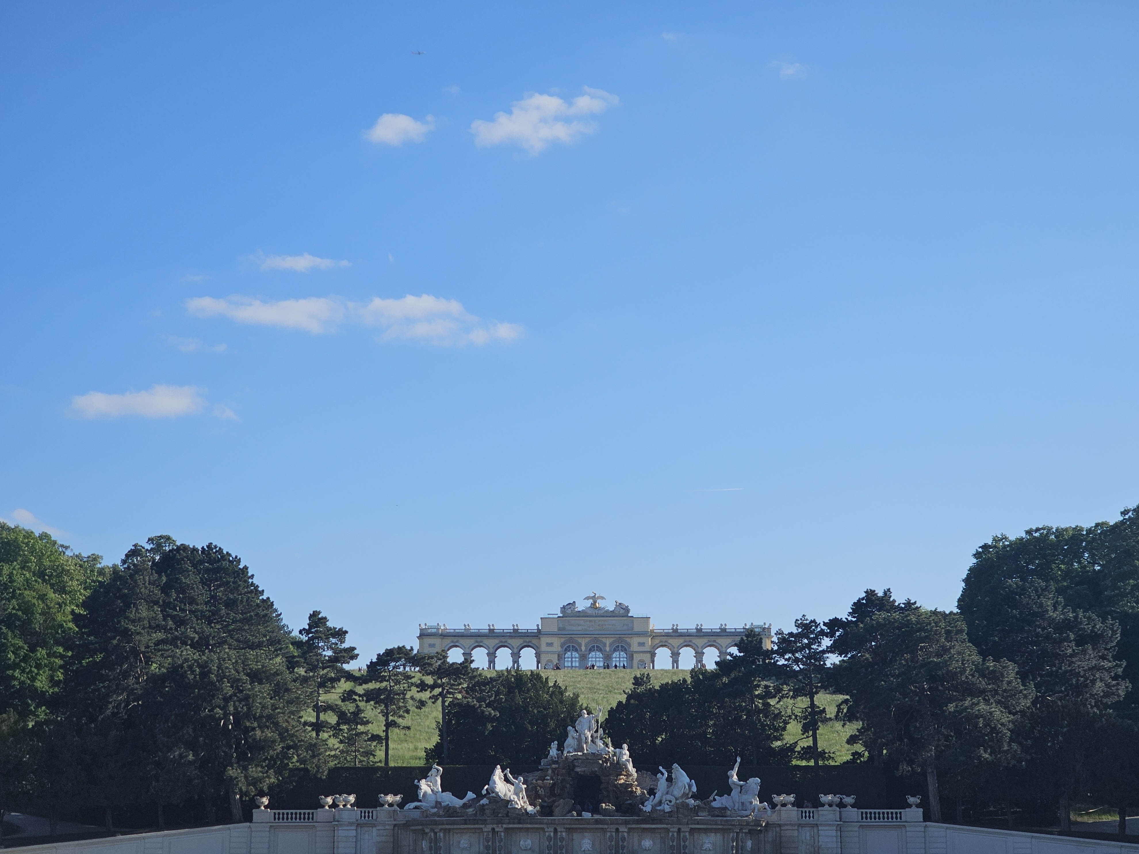 정원을 따라 언덕 위로 오르면, 글로리에트(Gloriette) 전망대가 나옵니다. 이곳은 합스부르크 왕가가 아침 식사와 연회를 즐겼던 곳이라고 해요. 전망대에 올라서 바라본 비엔나 시내 전경과 궁전 전체 풍경은 정말 압도적이었습니다. 특히 맑은 날씨에 올라가면 비엔나 도시와 도나우 강까지 시원하게 내려다볼 수 있어 꼭 가보길 추천합니다.