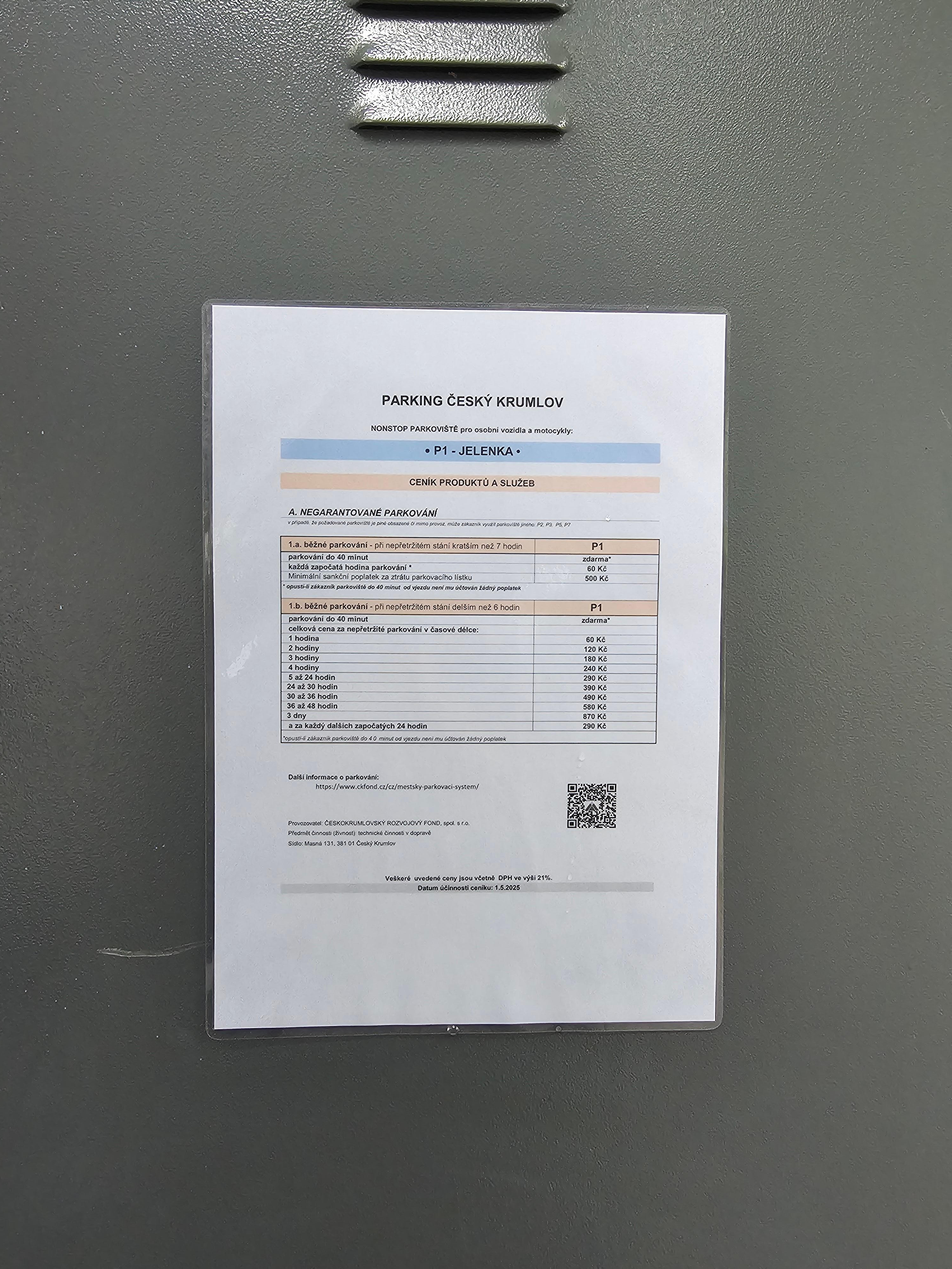 - 📱 일부 주차장은 QR 코드 또는 체코 현지 모바일 앱 연동 가능