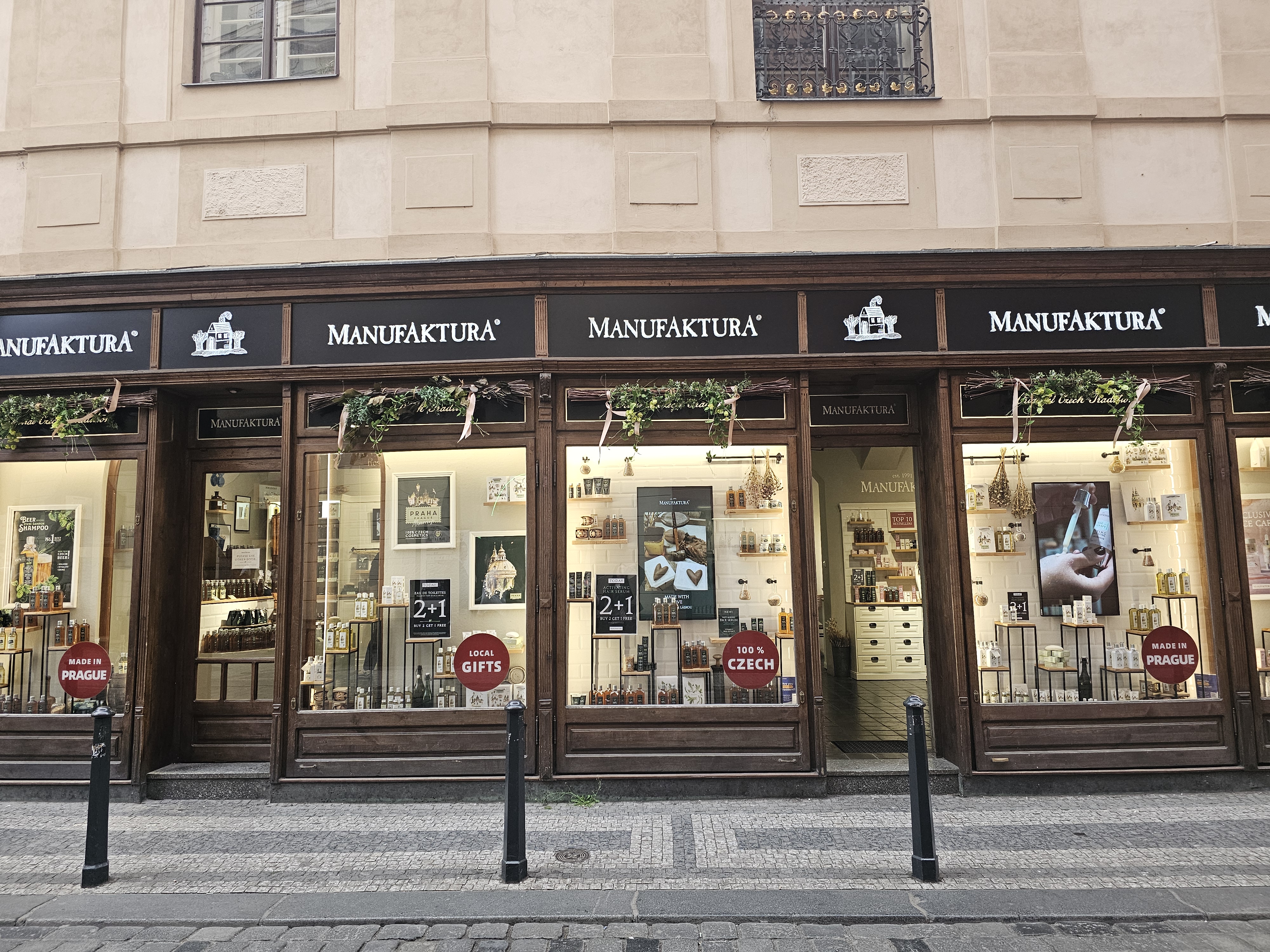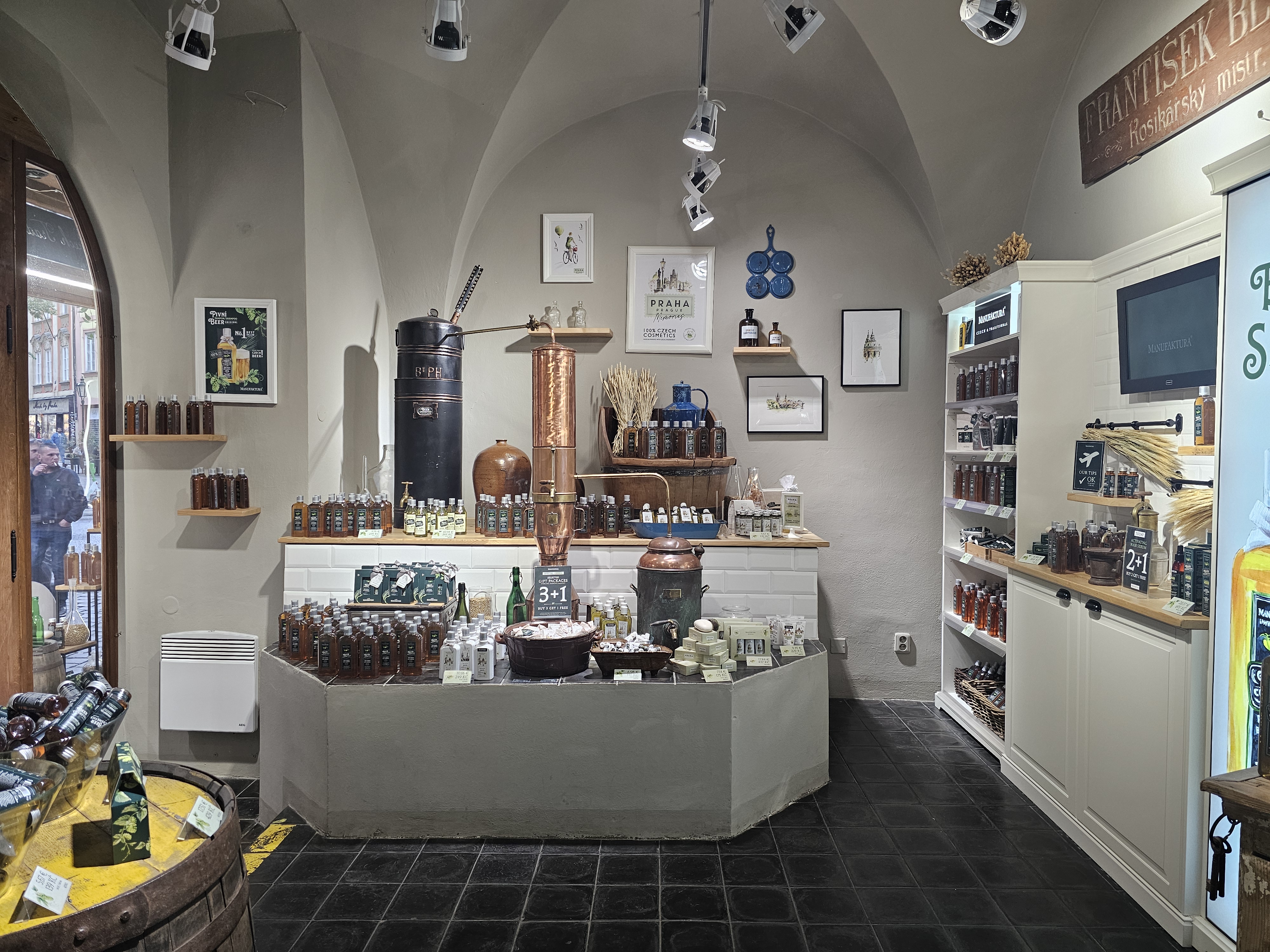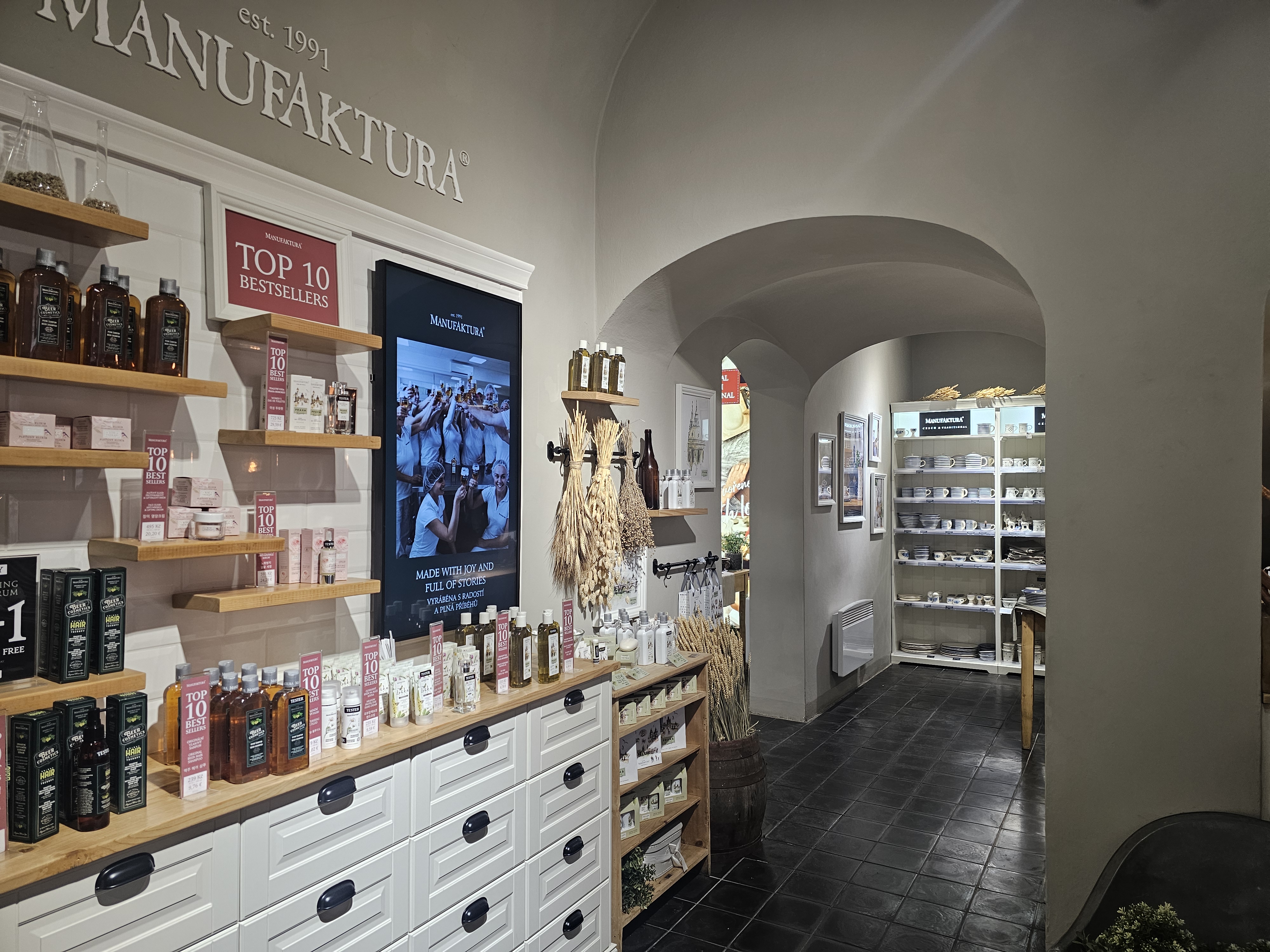 Manufaktura 매장은 외관부터 인테리어까지 모두 ‘프라하 감성’으로 가득 차 있어요. 나무 선반, 잔잔한 클래식 음악, 천장에 걸린 허브 리스까지, 인스타그램 감성 사진을 찍기에 완벽하죠.