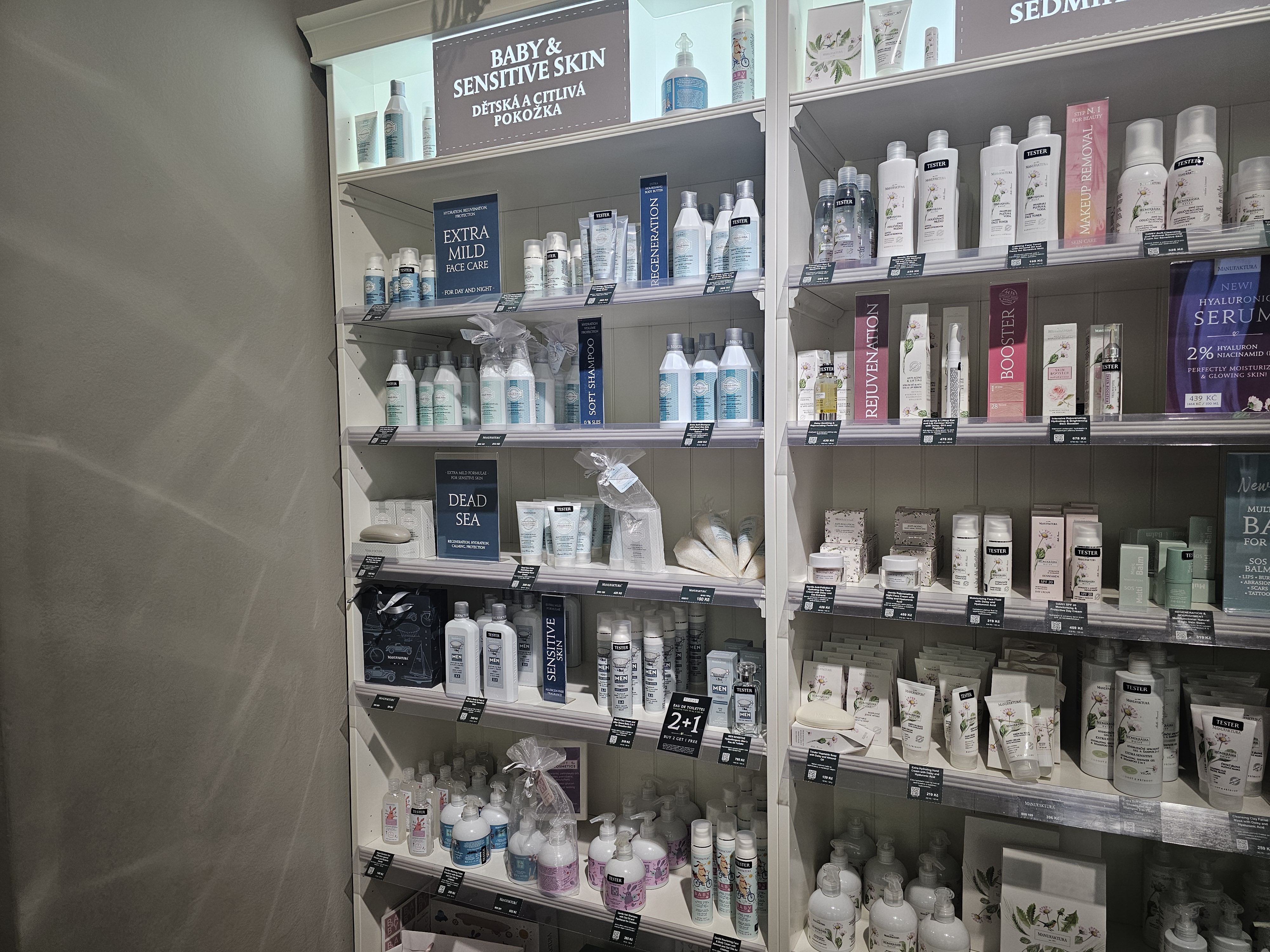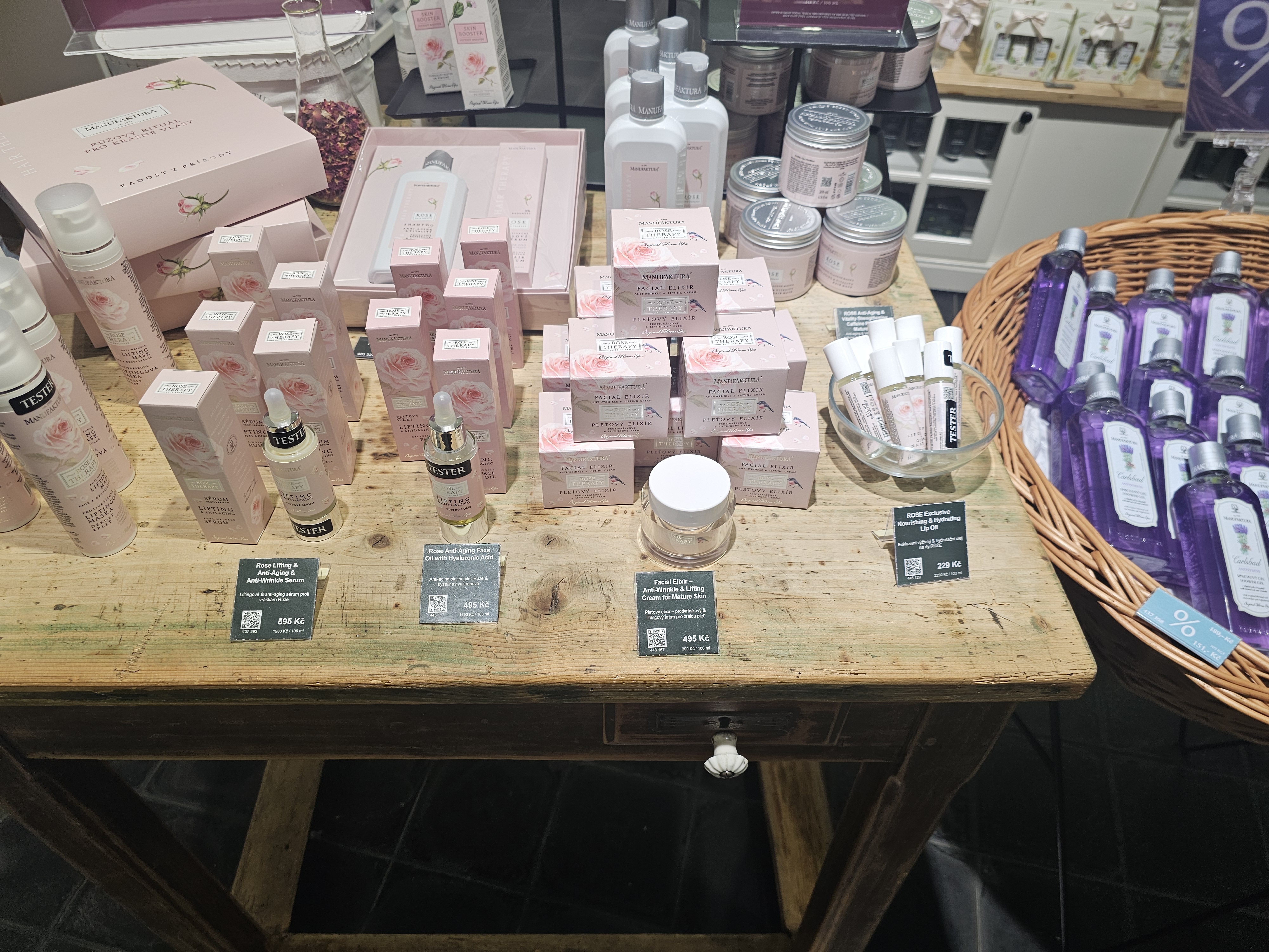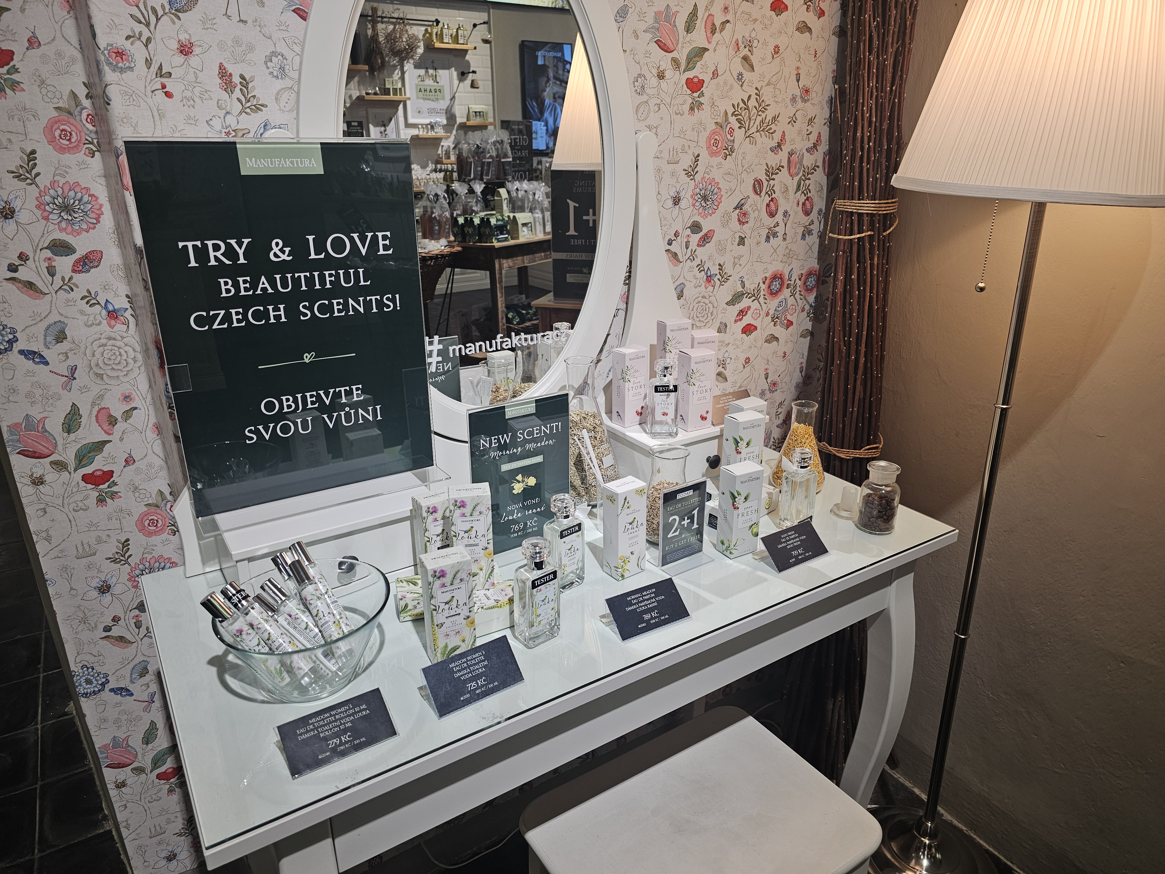Manufaktura 매장은 외관부터 인테리어까지 모두 ‘프라하 감성’으로 가득 차 있어요. 나무 선반, 잔잔한 클래식 음악, 천장에 걸린 허브 리스까지, 인스타그램 감성 사진을 찍기에 완벽하죠.