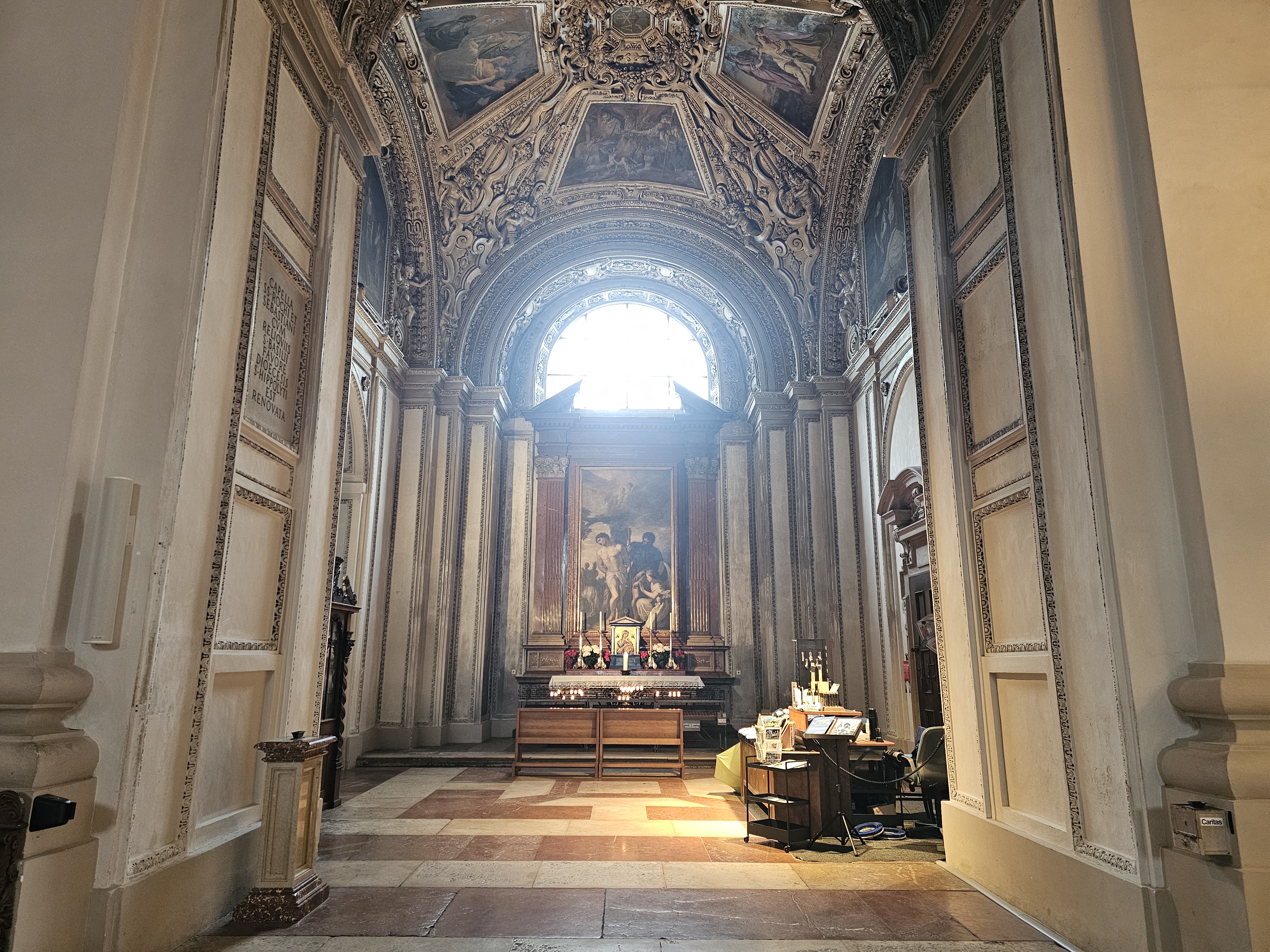 천장에는 구약성서의 장면을 묘사한 바로크 양식의 프레스코화가 웅장하게 펼쳐져 있어, 종교적인 상징성과 예술성을 동시에 제공합니다.