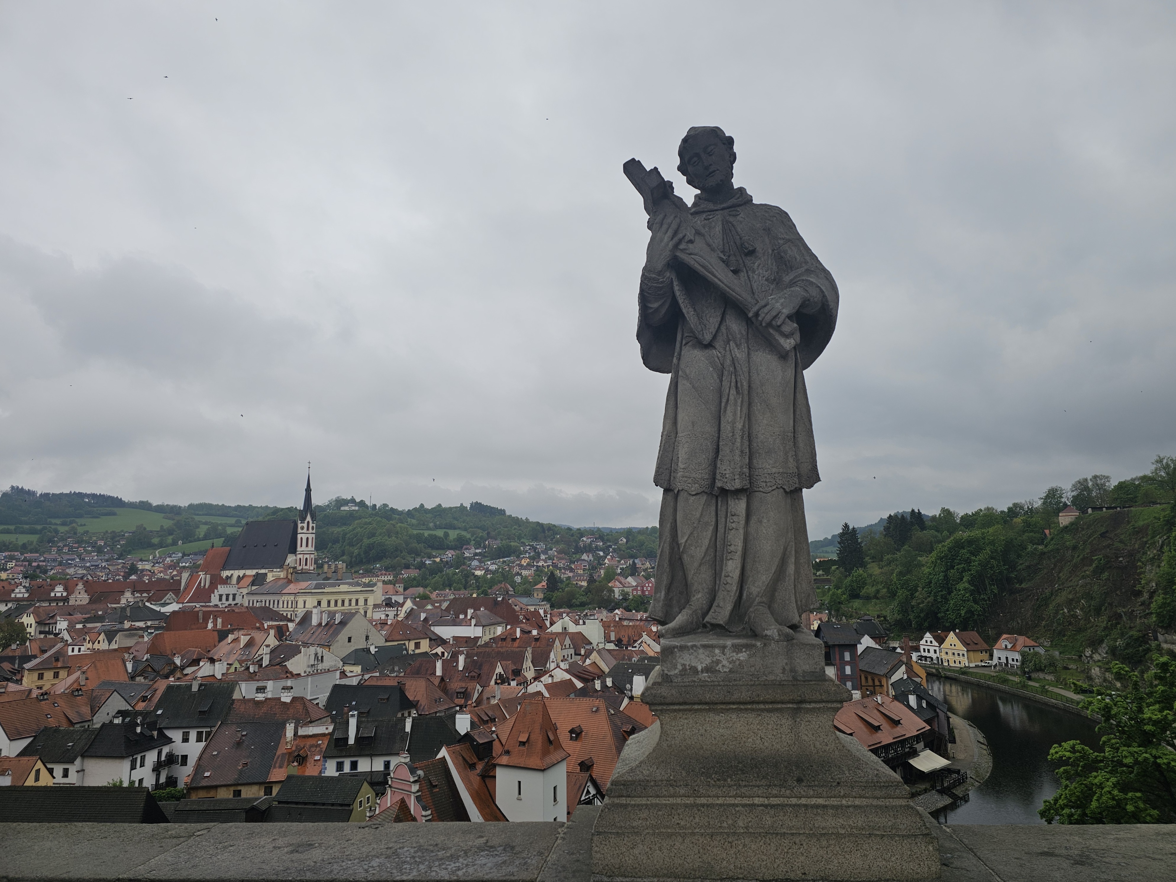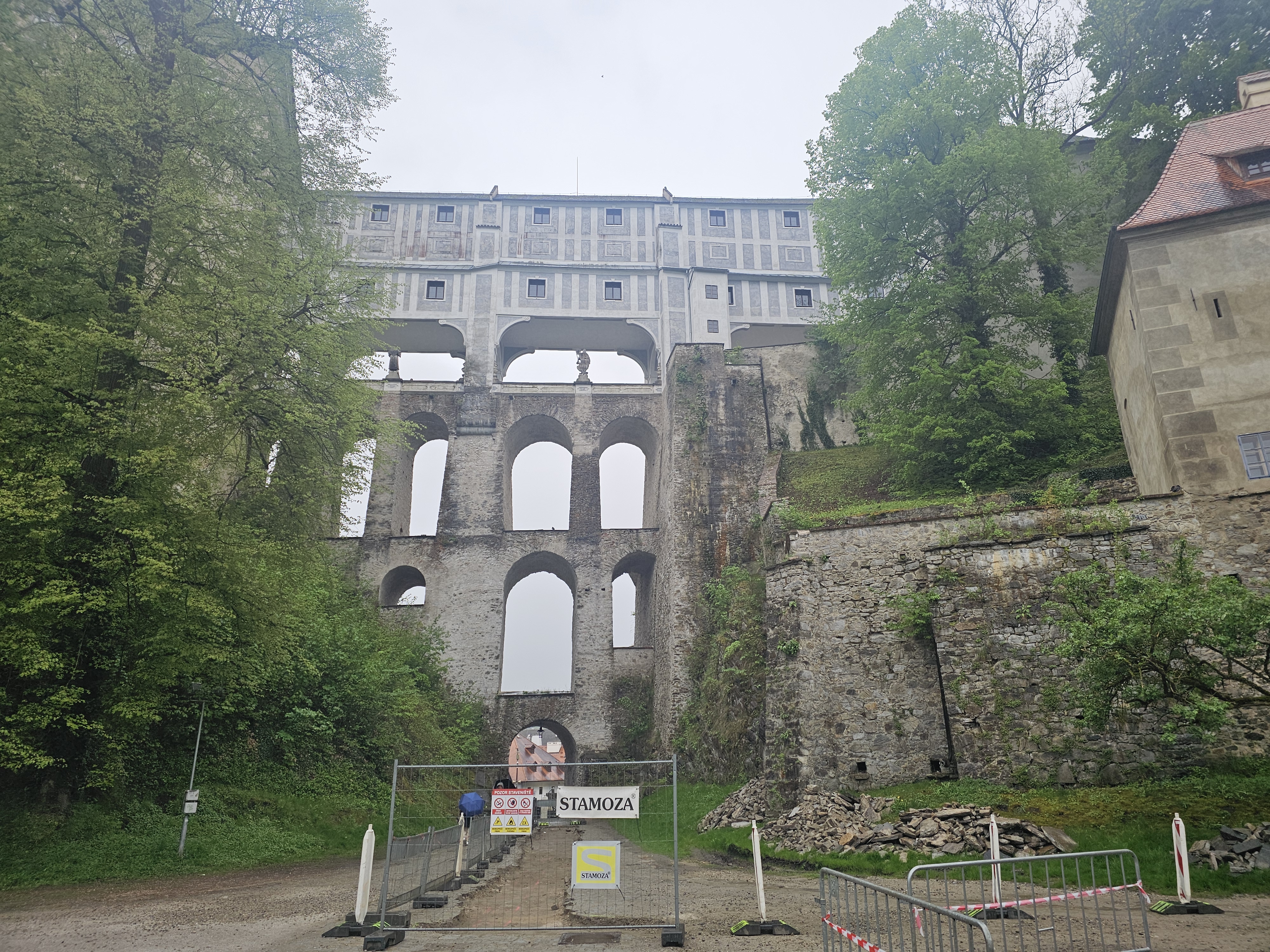 이른 아침, 우리는 망토다리를 지나 이발사의 다리(Lazebnický most)를 건넜을 때, 안개가 지붕 위를 감싸고 있는 풍경 속에서 처음으로 성의 원형 탑이 눈에 들어왔습니다. 분홍색과 녹색이 어우러진 외벽, 그리고 장식된 벽화가 마치 환상 속 세상에 들어온 듯한 기분을 줬죠. 사진으로는 느낄 수 없는, 정말 숨이 멎을 만큼 아름다운 순간이었습니다.