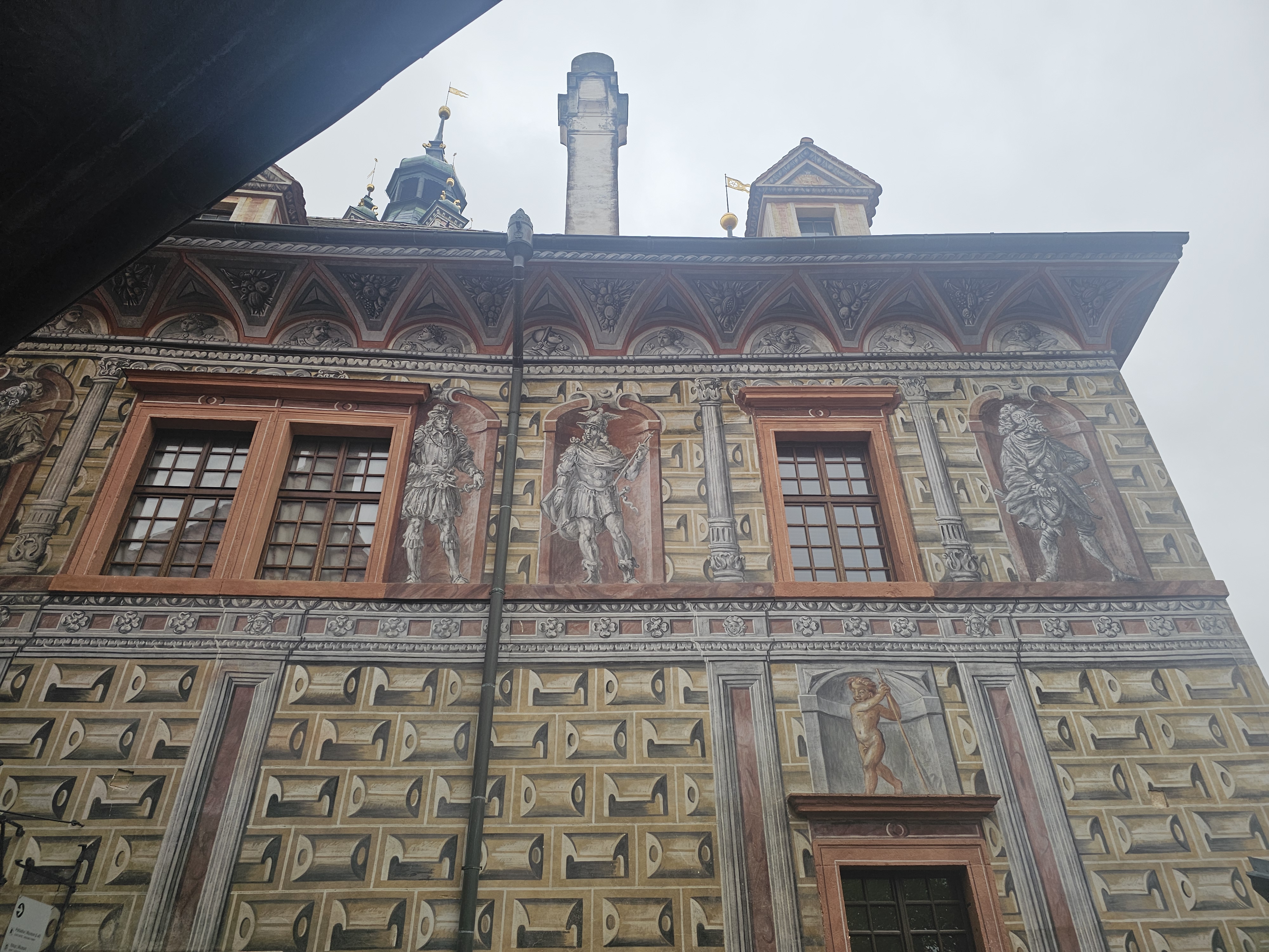 - 외벽에는 알록달록한 프레스코화, 가문 문장과 상징이 정교하게 그려짐