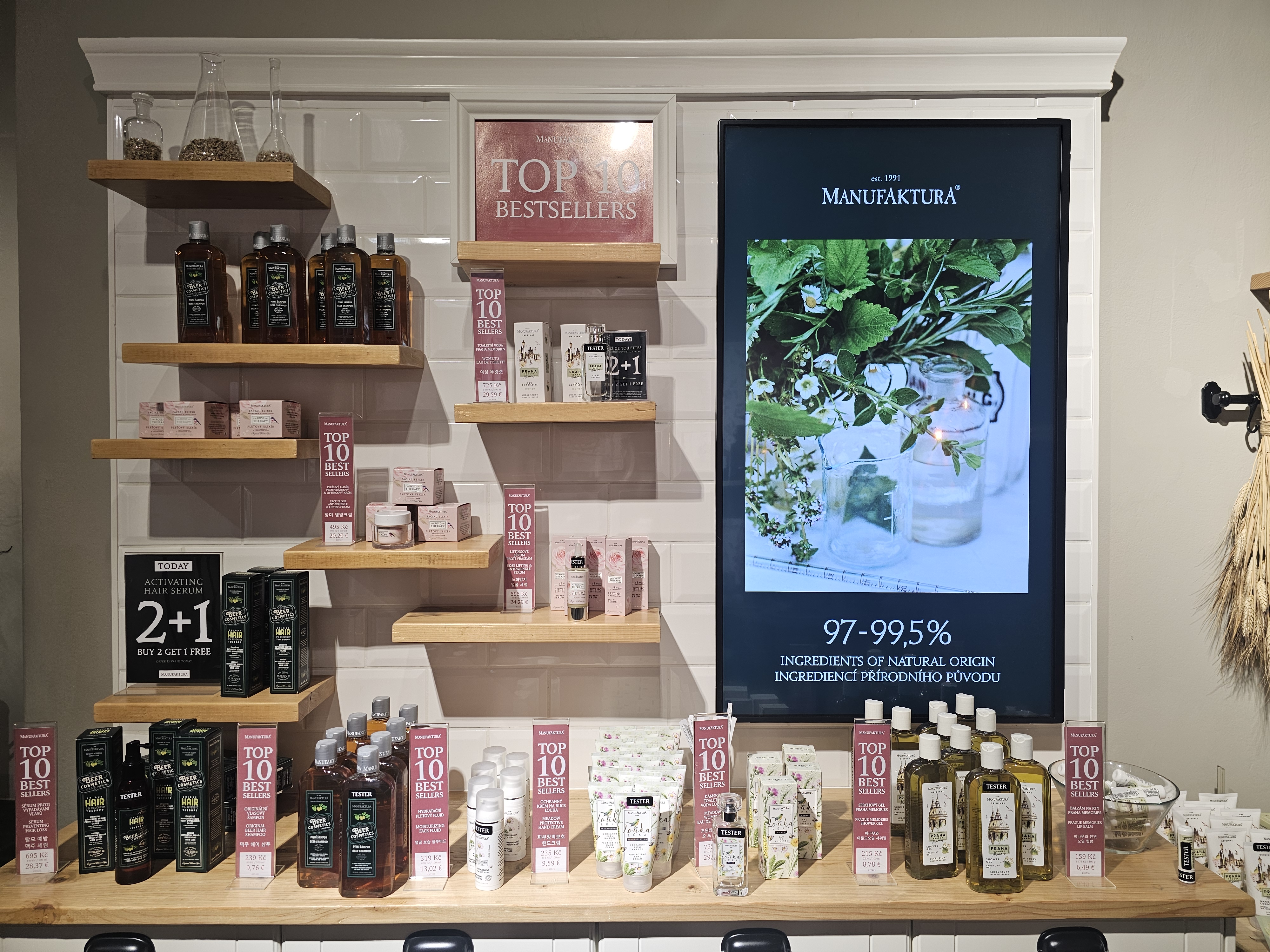Manufaktura 매장은 외관부터 인테리어까지 모두 ‘프라하 감성’으로 가득 차 있어요. 나무 선반, 잔잔한 클래식 음악, 천장에 걸린 허브 리스까지, 인스타그램 감성 사진을 찍기에 완벽하죠.